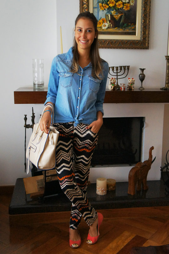 Sempre entro aqui mas nunca comento, mas esse seu look me ganhou…amei o jeito que você combinou a calça estampada com a camisa jeans.