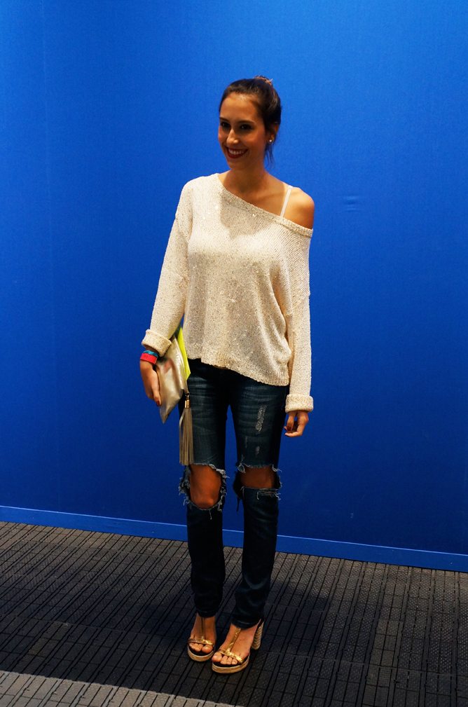 E para o primeiro dia de Fashion Rio, eu resolvi ir bem descolada. Queria muito usar essa calça rasgada Animale, então pra compor a produção resolvi colocar uma malha + acessórios como cinto + clutch e um salto bem alto. Uma produção pra lá de cool. Eu adorei e vocês? Look aprovado para o primeiro dia de Fashion Rio?!