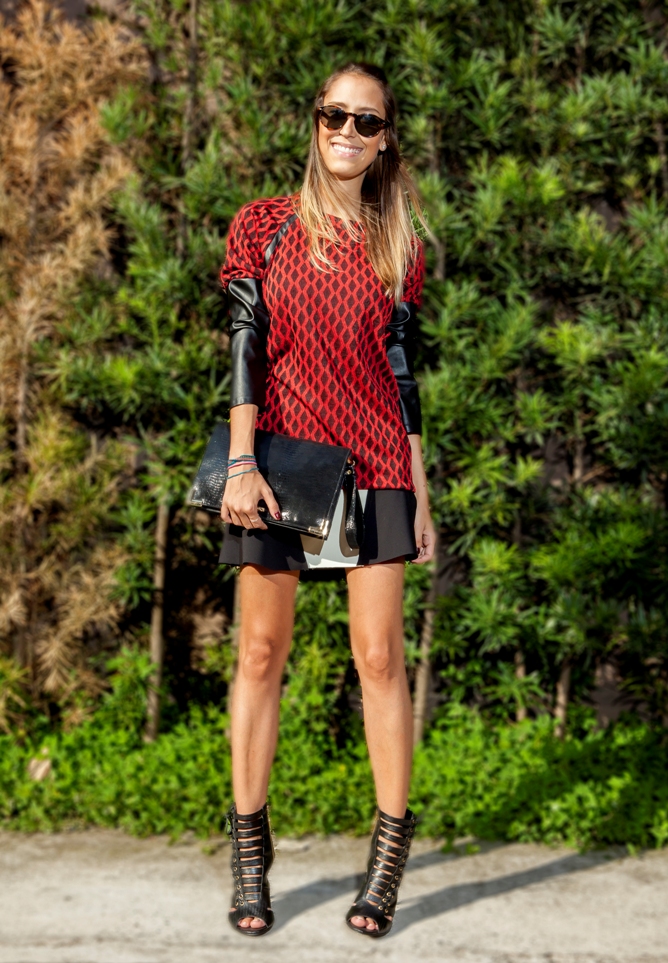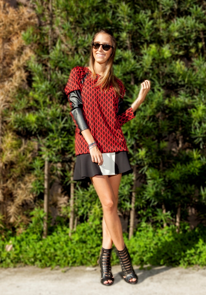 Sei que o clima é de Copa, mas o look de hoje é baseado no vermelho, preto e branco. Moletom estampado com detalhes em couro + saia godê bicolor foram as peças chave para essa produção. Pra deixar ainda mais cool e estilosa, optei pela open boot preta + clutch e óculos de sol. Ótima opção para sair com as/os amigos ou até mesmo para trabalhar – trocaria apenas a clutch por uma bolsa maior. Eu adorei e vocês?