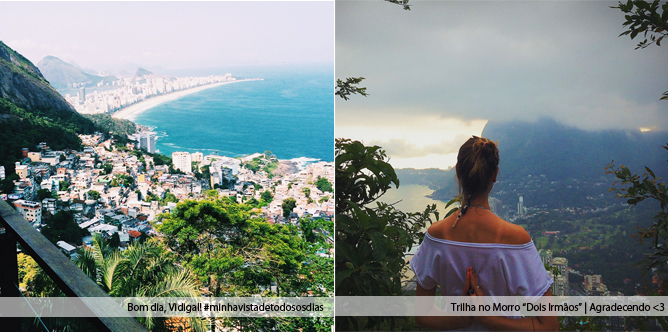 Confesso que esse hotel foi um ótimo lugar para eu descansar e renovar as energias, a vista como vocês podem ver na foto acima é de tirar o fôlego. Logo quando cheguei por lá, subi de kombi e fiz amizade com uma turma do Rio que estavam indo fazer uma trilha no morro “Dois Irmãos”. Me aventurei e fui junto, foi incrível! Logo, depois de 1h30 de trilha, chegamos no topo da pedra – essa foto acima – aproveitei para agradecer e fotografar. É tipo ‘U-A-U!”, hehe. Já no fim do dia, retornei para o “Mirante do Arvrão” para descansar. No dia seguinte, acordei cedo, curiosa para ver a vista que ao abrir a cortina, direto da minha cama já via o mar, onde tomei meu café da manhã. Delícia! =) Pela tarde, resolvi almoçar com amigas em Ipanema, mas pra isso, precisava pegar a kombi novamente para descer. Foi aí que conheci a Vitória e o Arthur, duas crianças incríveis que moram no Vidigal, fizemos amizade e eles me deram várias dicas da Comunidade. Uns fofos e super carismáticos. Logo depois do almoço no “Balada Mix”, fui a praia, observar aquele mar e sentir a brisa fria e gostosa daquele dia. Estava ansiosa, afinal, logo depois iria para a casa da Deborah Secco e de lá iriamos para o PROJAC. Yes! =)