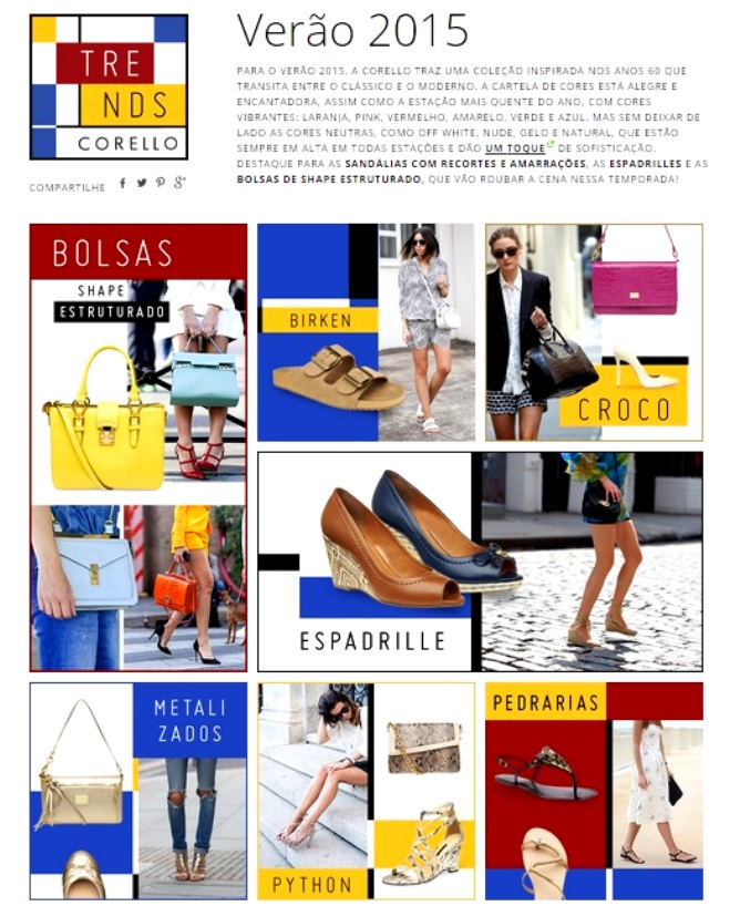 Para deixar você por dentro das tendências de verão, a marca lançou a página Corello Trends, que reúne as apostas para estação e dicas de como aplicá-las no dia a dia. As apostas vão desde espadrilles até as ‘it bags’ do momento, que são aquelas mais estruturadas. Vejam só as minhas escolhas – foram várias, por que tábem difícil de escolher apenas uma! =)